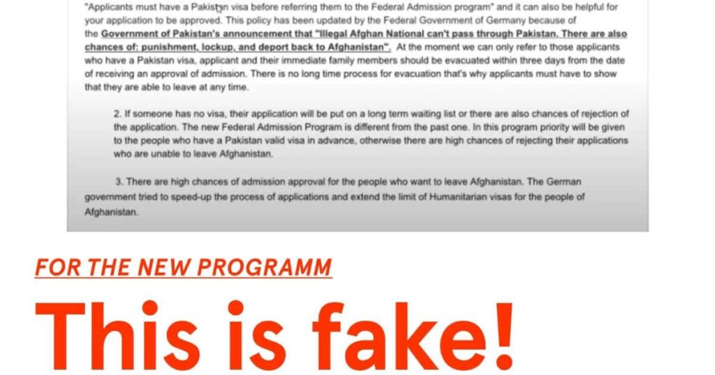 Kabul Luftbrücke hat KEINE Befugnis, irgendjemandem eine Aufenthaltszusage zu erteilen. Wenn ihr hören oder sehen solltet, dass jemand solche Aussagen macht, ist das garantiert eine Fälschung! Hier nur eins von vielen Beispielen: